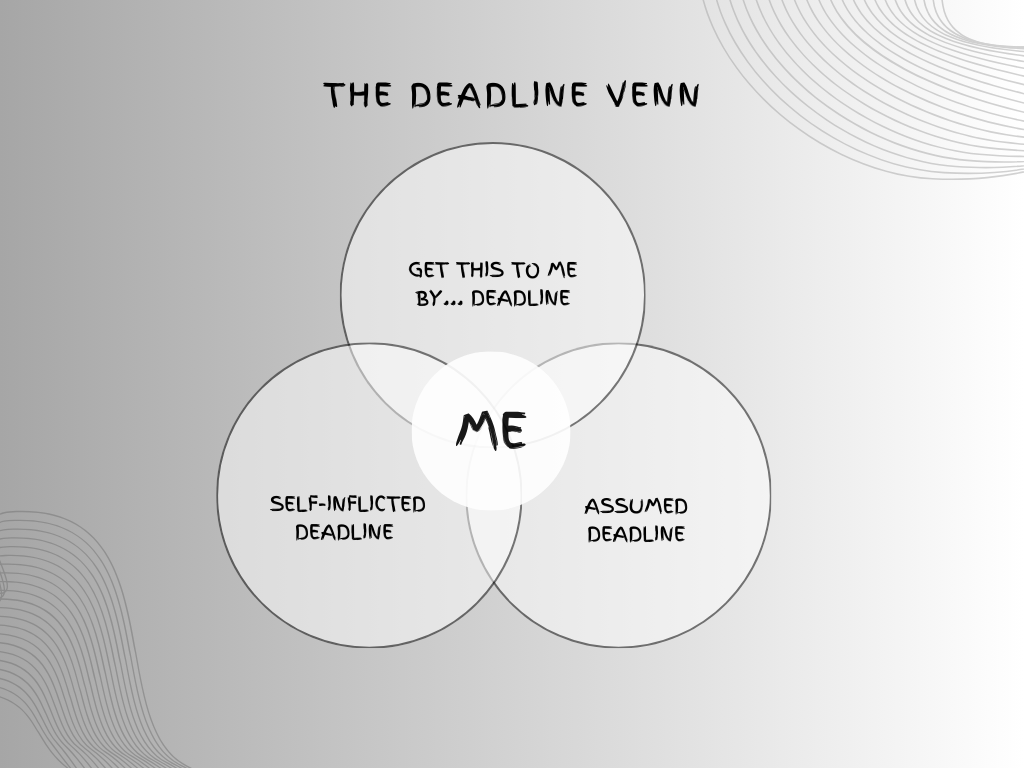 Some deadlines are inflicted upon us. Others are assumed (by us, based on what we think we know about someone else's timeline). Then there are the deadlines we impose upon ourselves (aka lighting a fire under our butts).